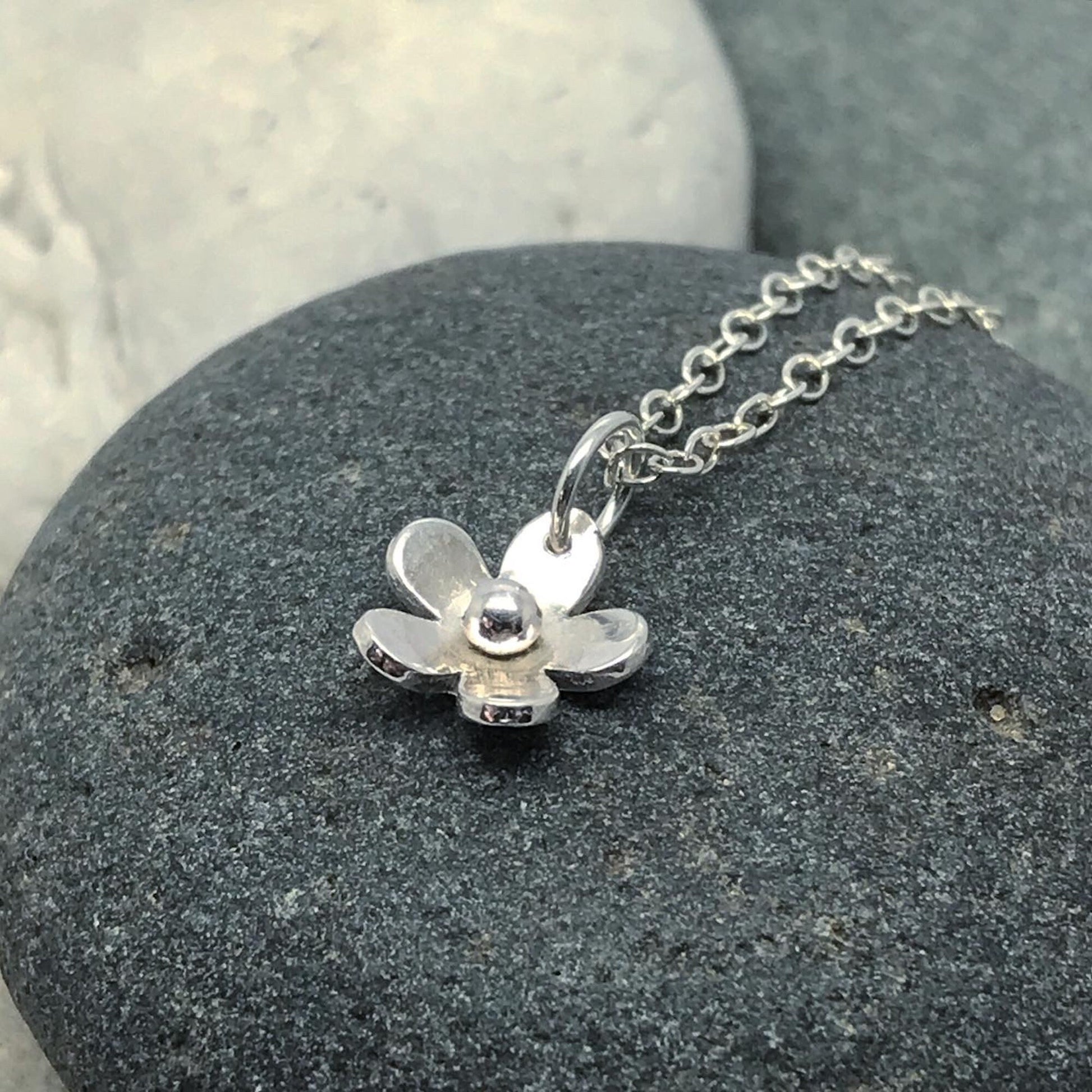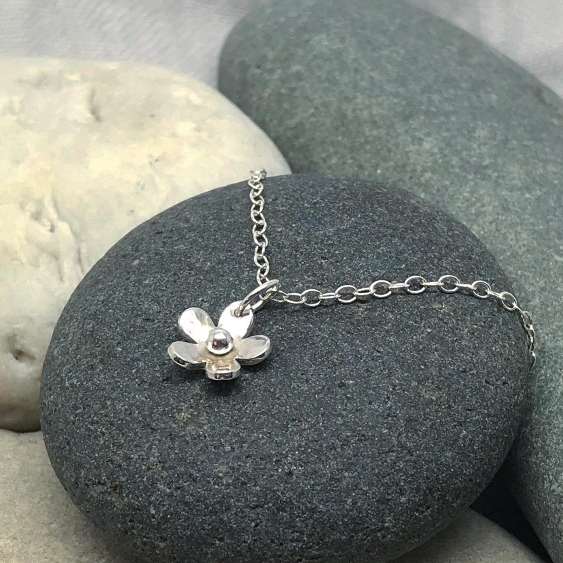 The daisy measures approximately 10mm across and hangs from a sterling silver trace chain.