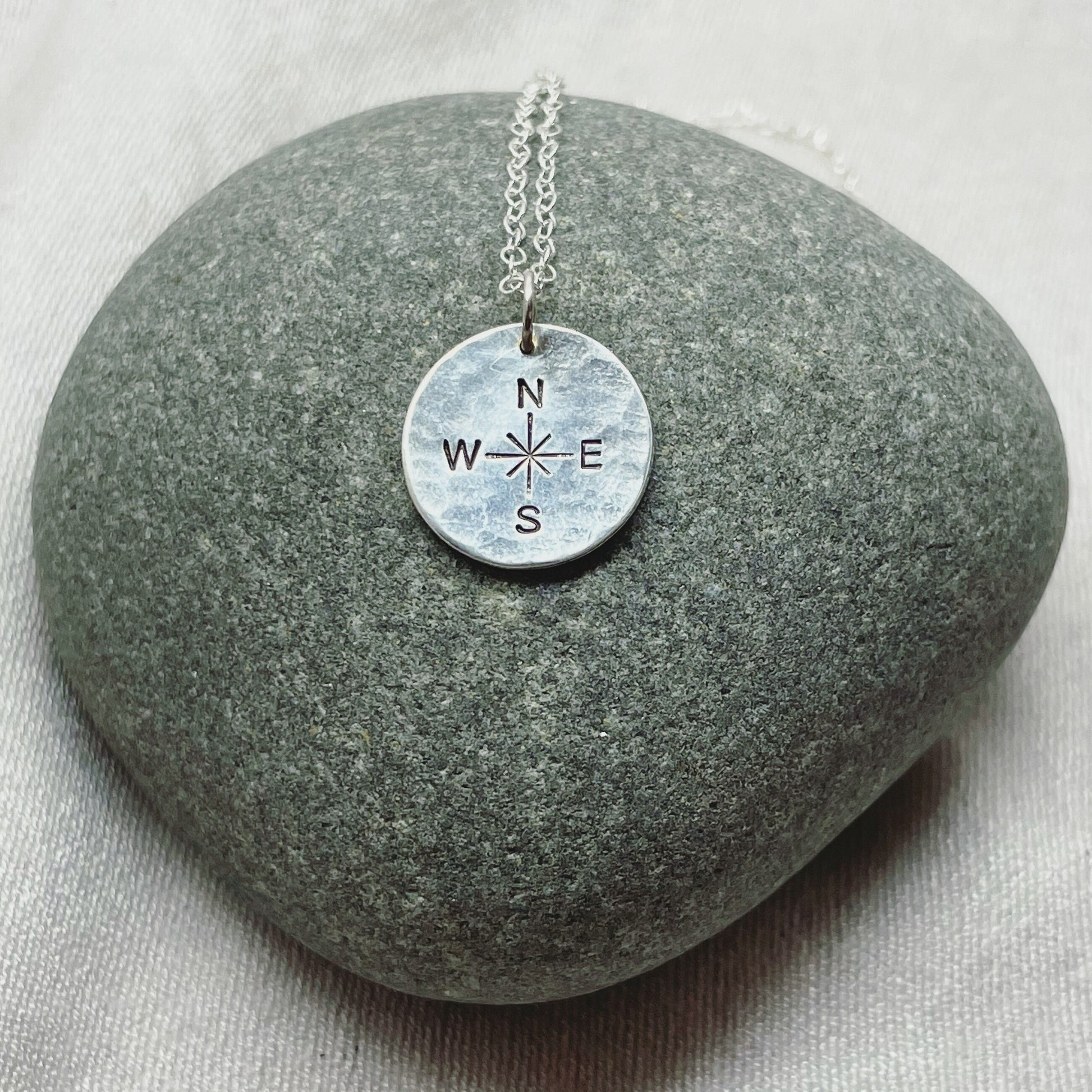 The sterling silver compass is hand cut from hammered sterling silver and hand stamped with an oxidised compass design.