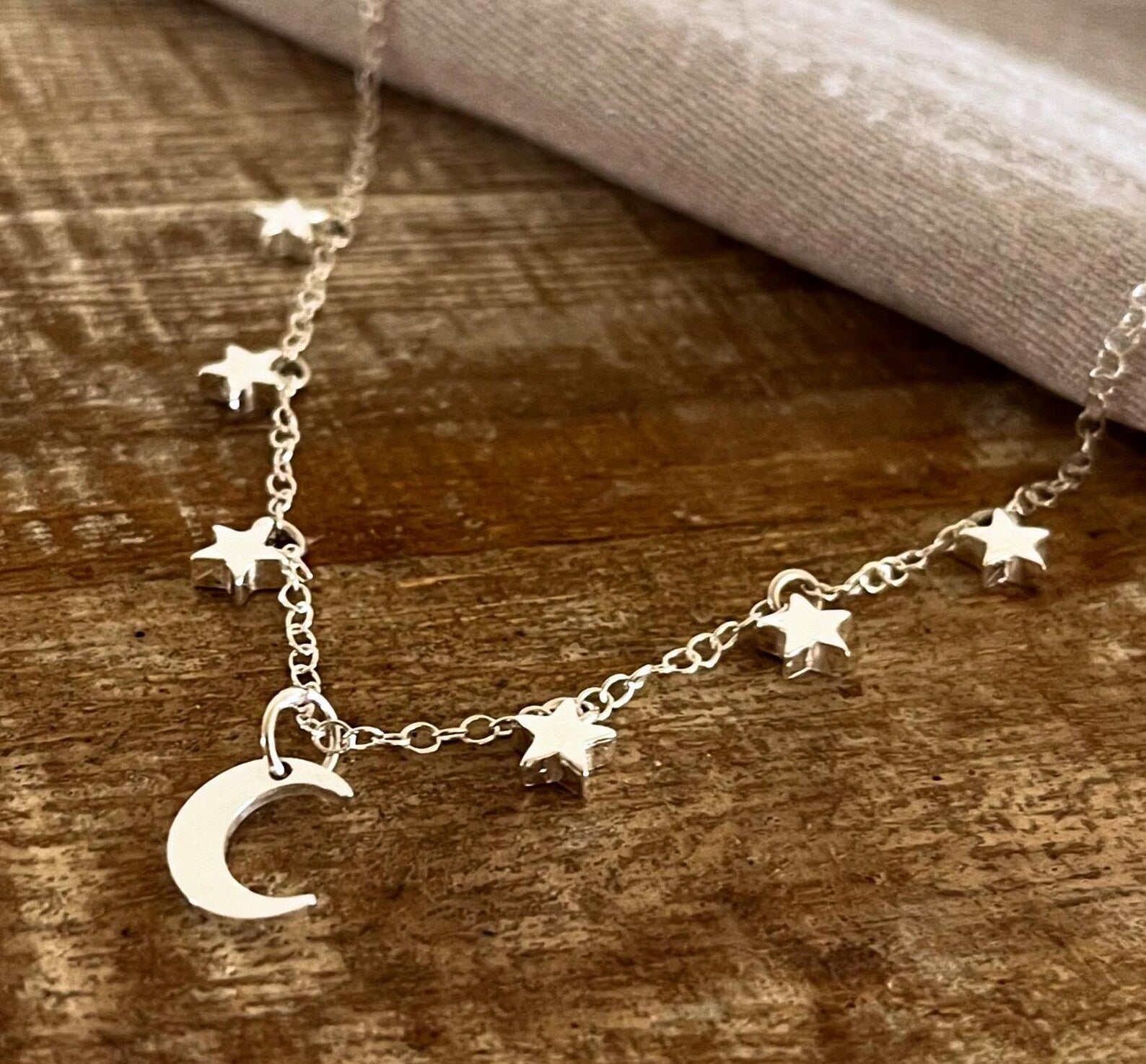 A crescent moon and six silver stars adorn this delicate sterling silver necklace.
