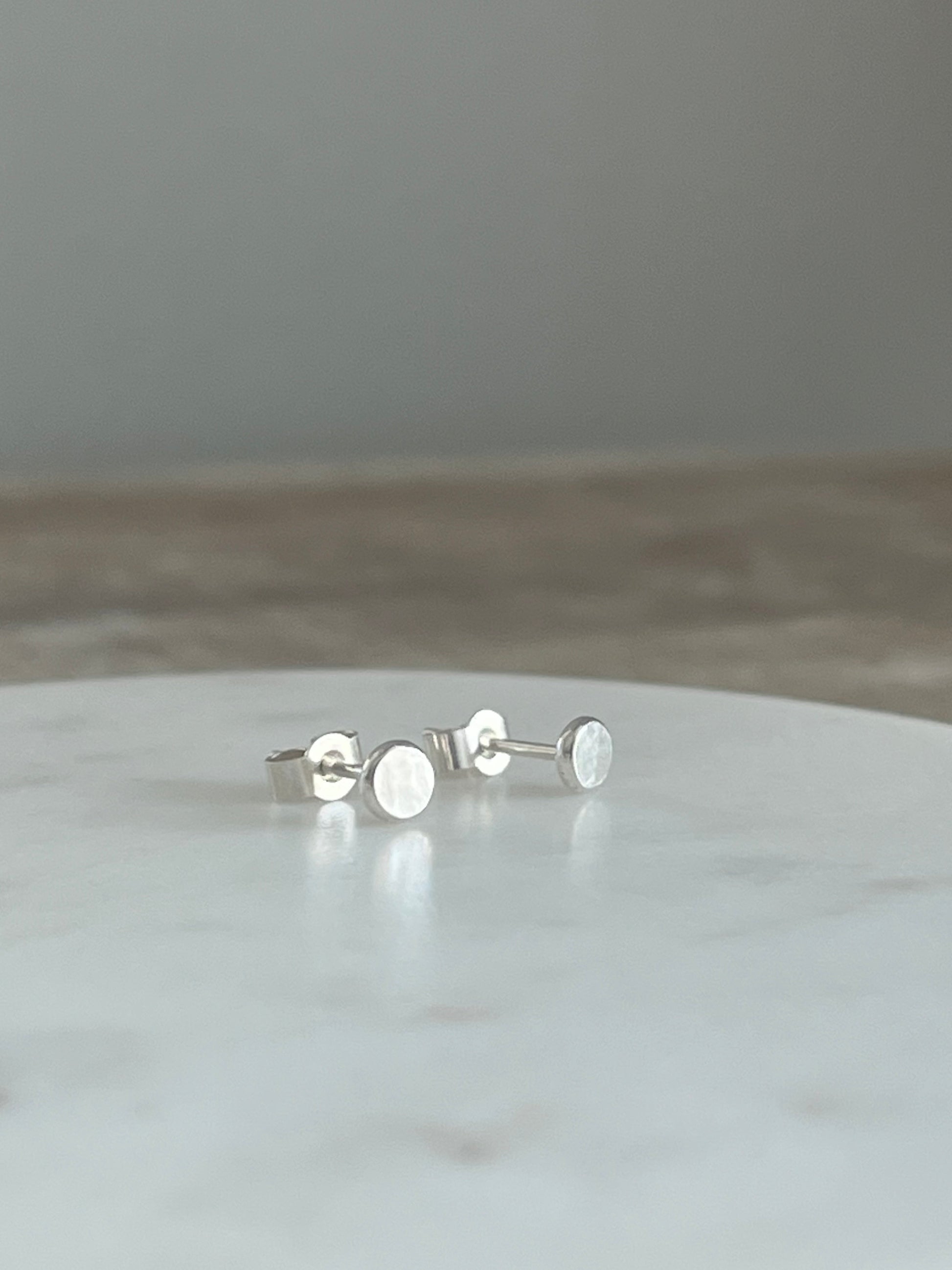 A pair of small sterling silver flattened pebble earrings handcrafted from recycled silver. Measuring approximately 4mm these little studs are great for everyday wear on their own or layered with your other earrings.